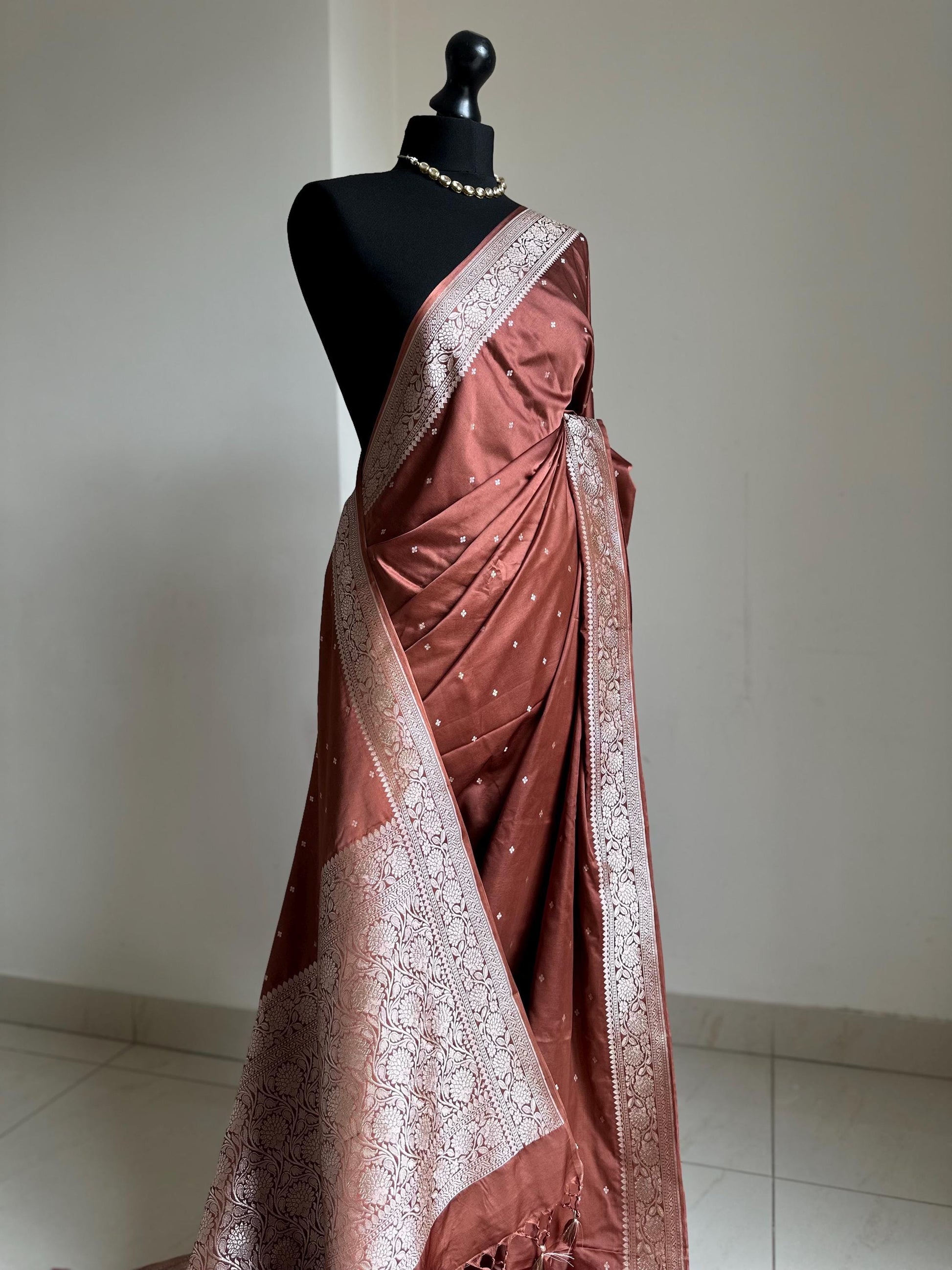 Banarasi katan silk wedding saree in chocolate brown, with champagne gold Zari