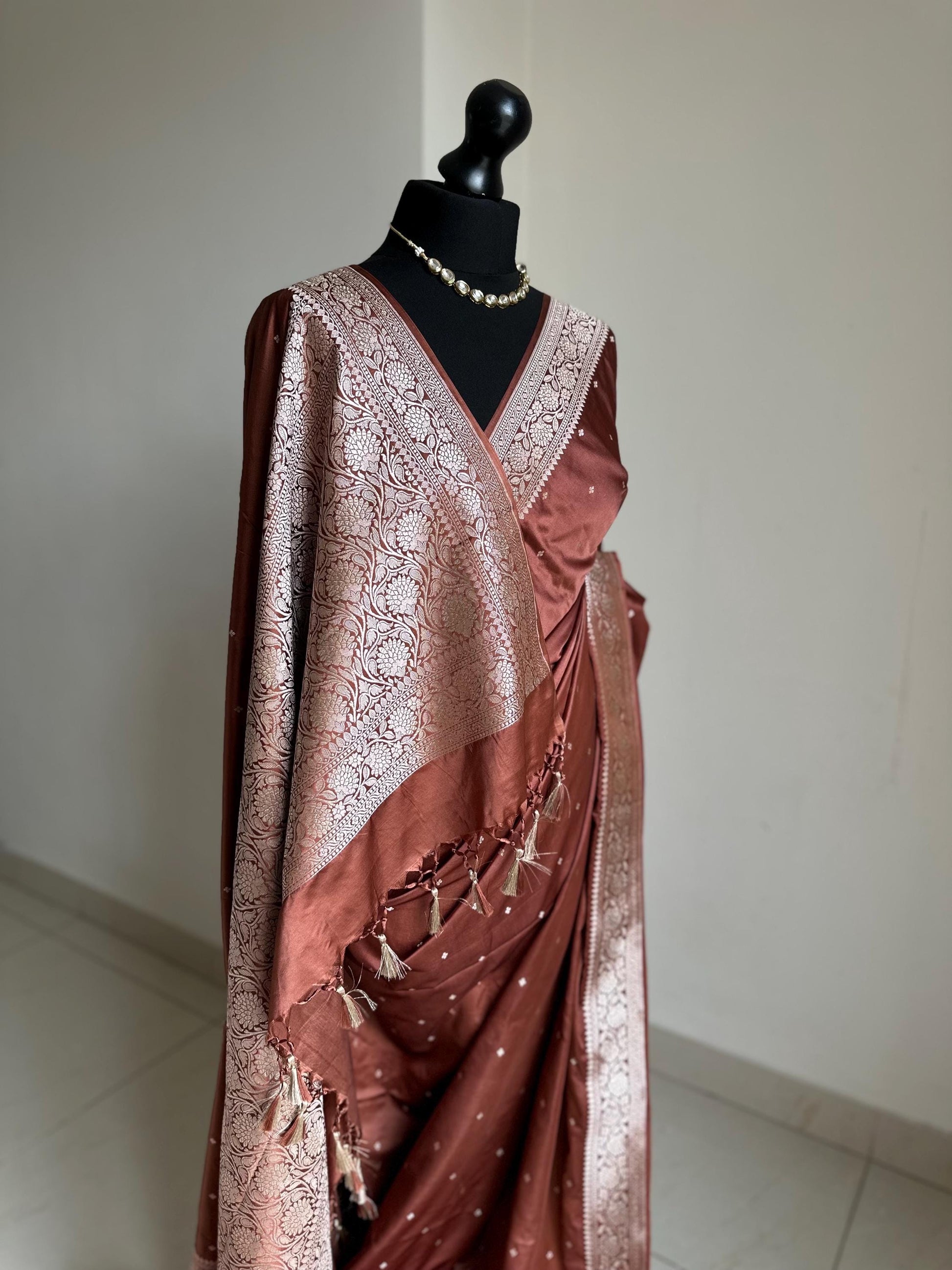 Classic and timeless Banarasi semi Katan silk saree in chocolate brown. Silk saree with plain contrast blouse with border for sleeve cuffs. Rich champagne gold zari. Perfect statement saree that’s bang on trend for weddings and events. Rich pallu with zari and tassels, available in other colours.