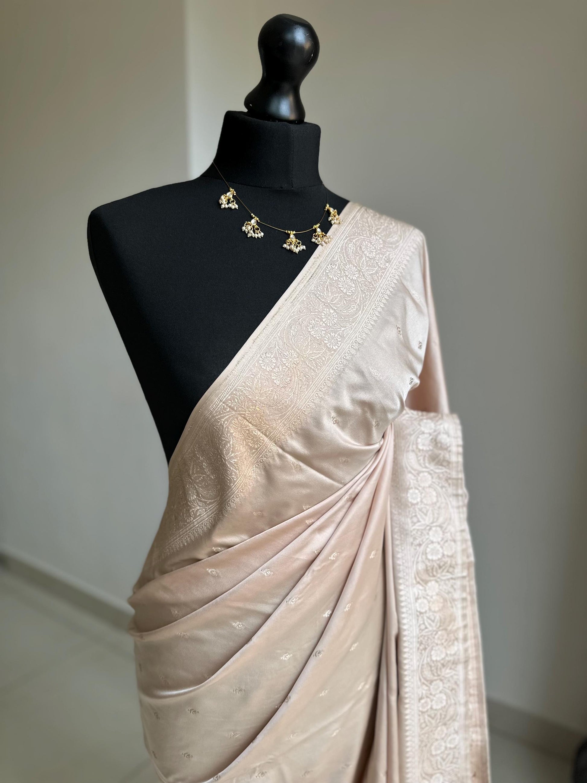 Classic and timeless Banarasi Katan silk saree in pastel beige blush. Silk saree with plain contrast blouse with border for sleeve cuffs. Rich champagne gold zari. Perfect statement saree thats bang on trend for weddings and events. Elegant pastel saree for all traditional events. Rich pallu with zari and tassels, available in other colours.