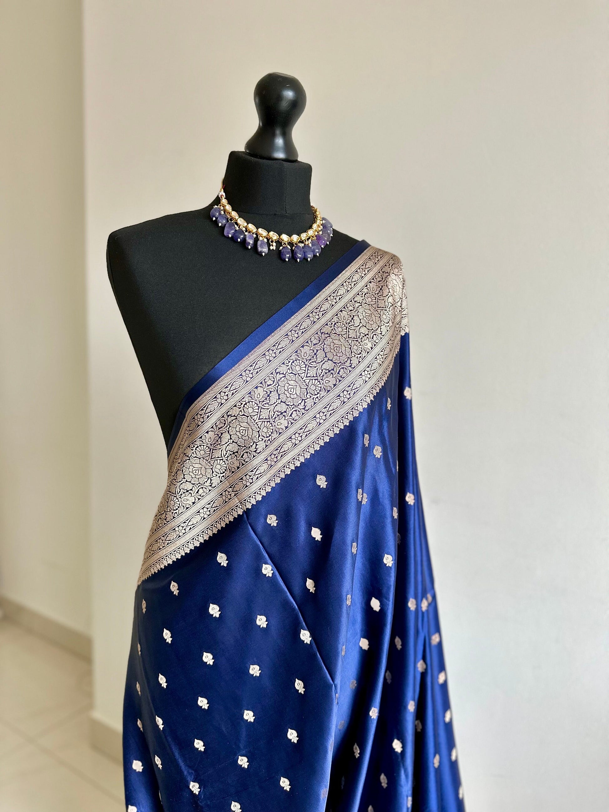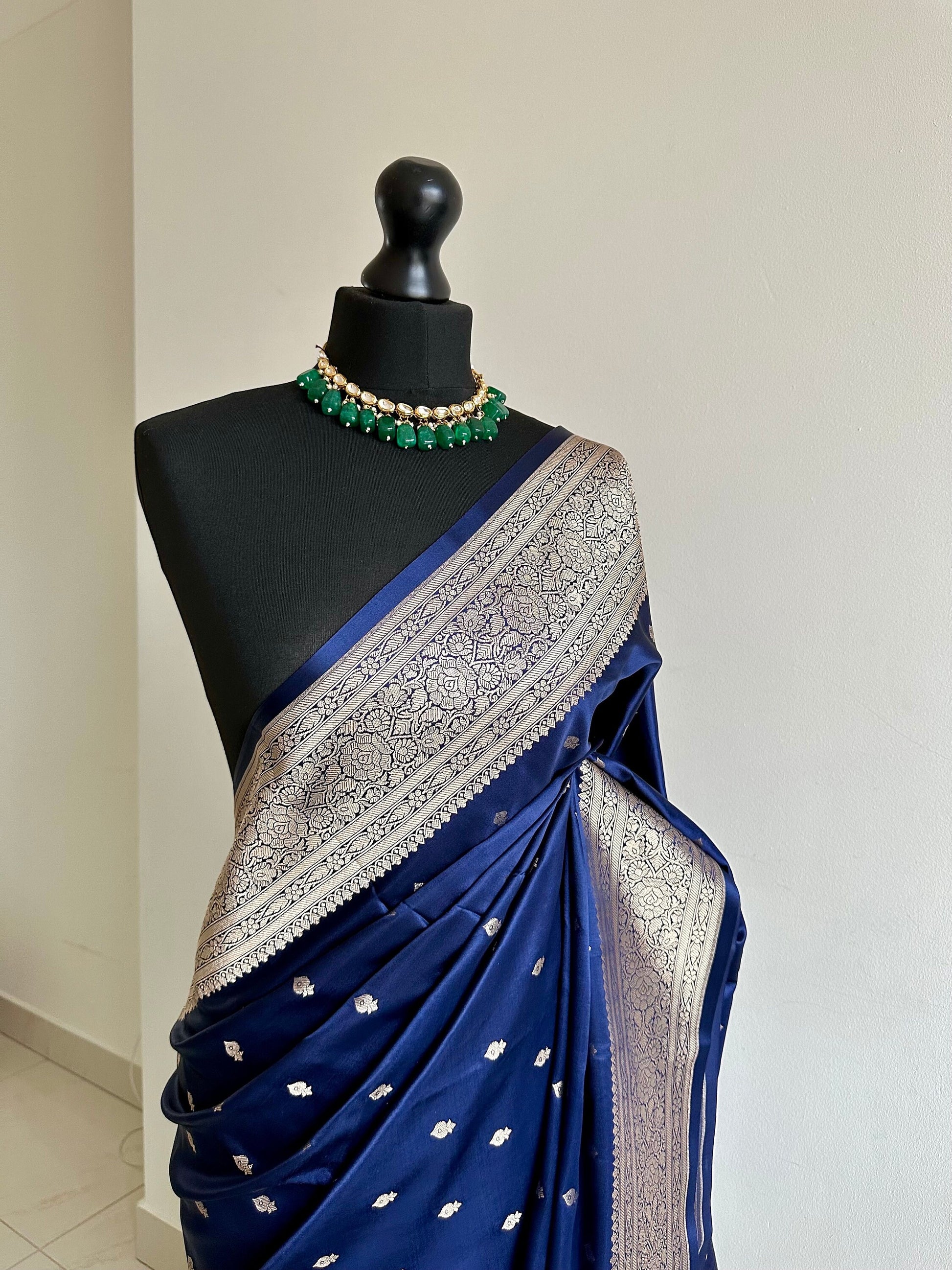 Classic and timeless Banarasi Katan silk saree in navy blue. Navy blue silk saree with plain contrast blouse with border for sleeve cuffs. Rich gold zari. Perfect statement saree thats bang on trend for wedding and events. Koorai style saree for all traditional events. Rich pallu with zari, available in other colours.