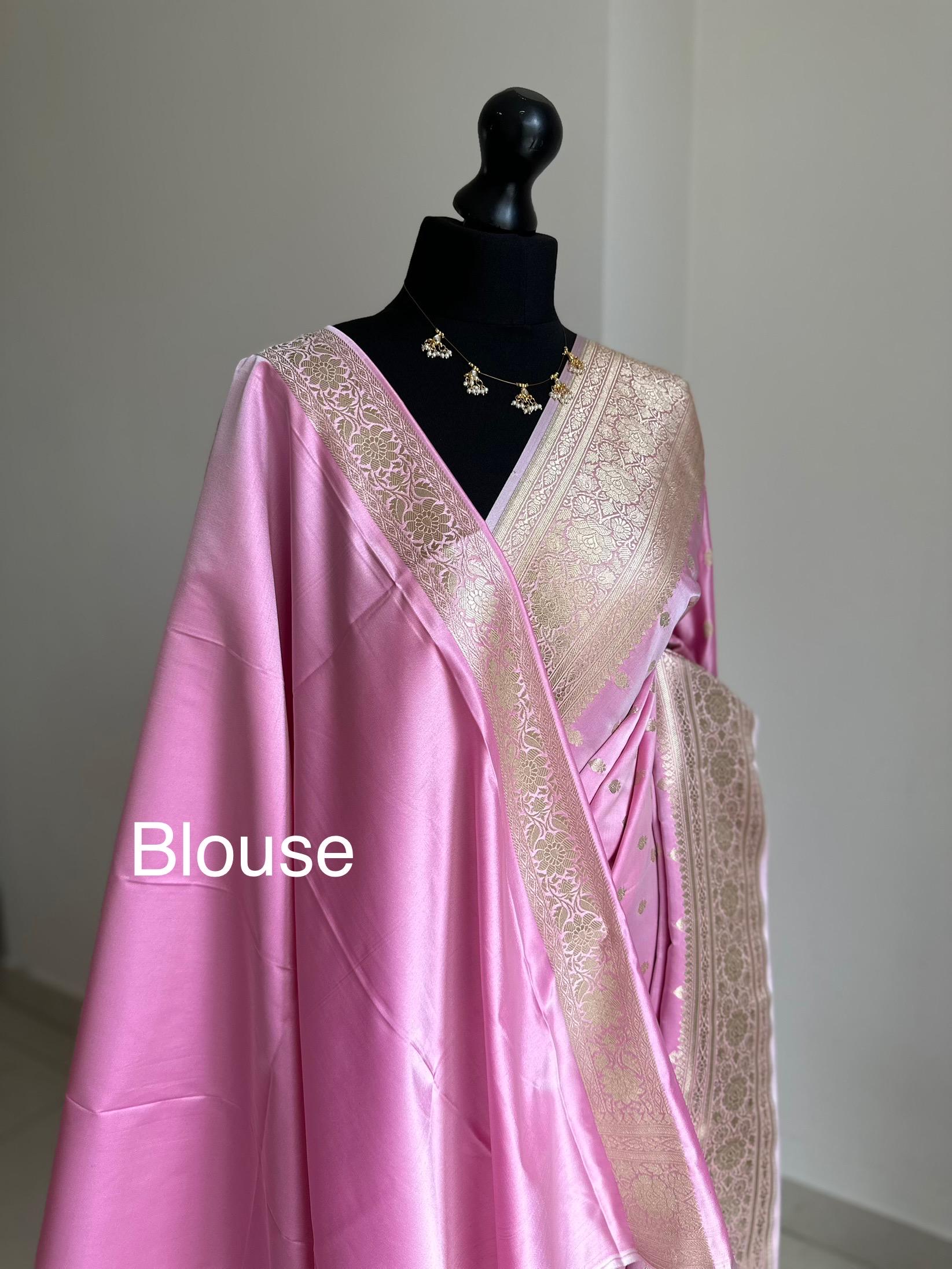 Banarasi silk soft pink wedding saree with gold zari. Gold and baby pink silk traditional saree with plain contrast blouse with border