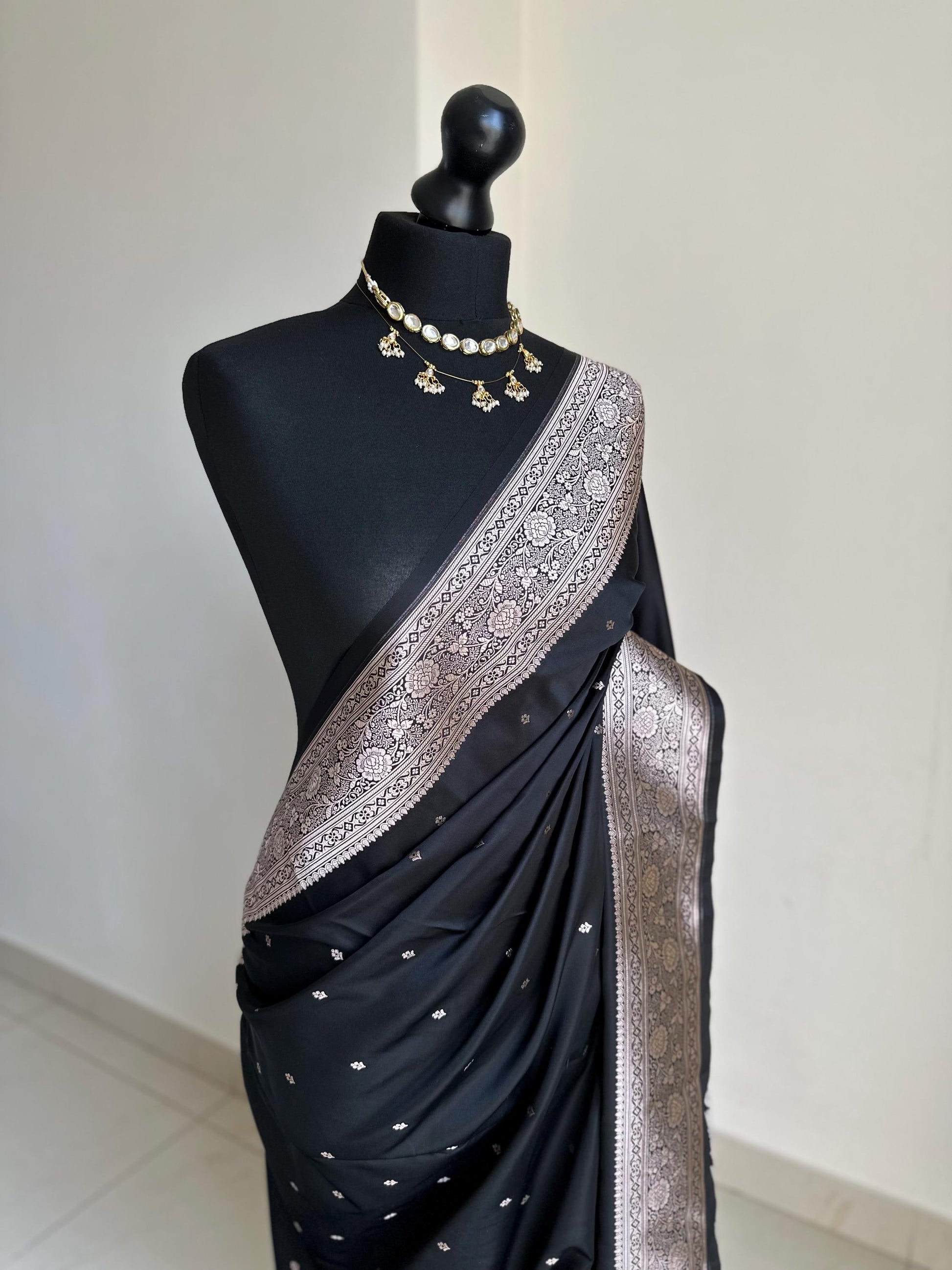 Black and champagne gold katan semi silk wedding saree with zari buta design . Stunning soft and elegant saree for bridal and occasion wear