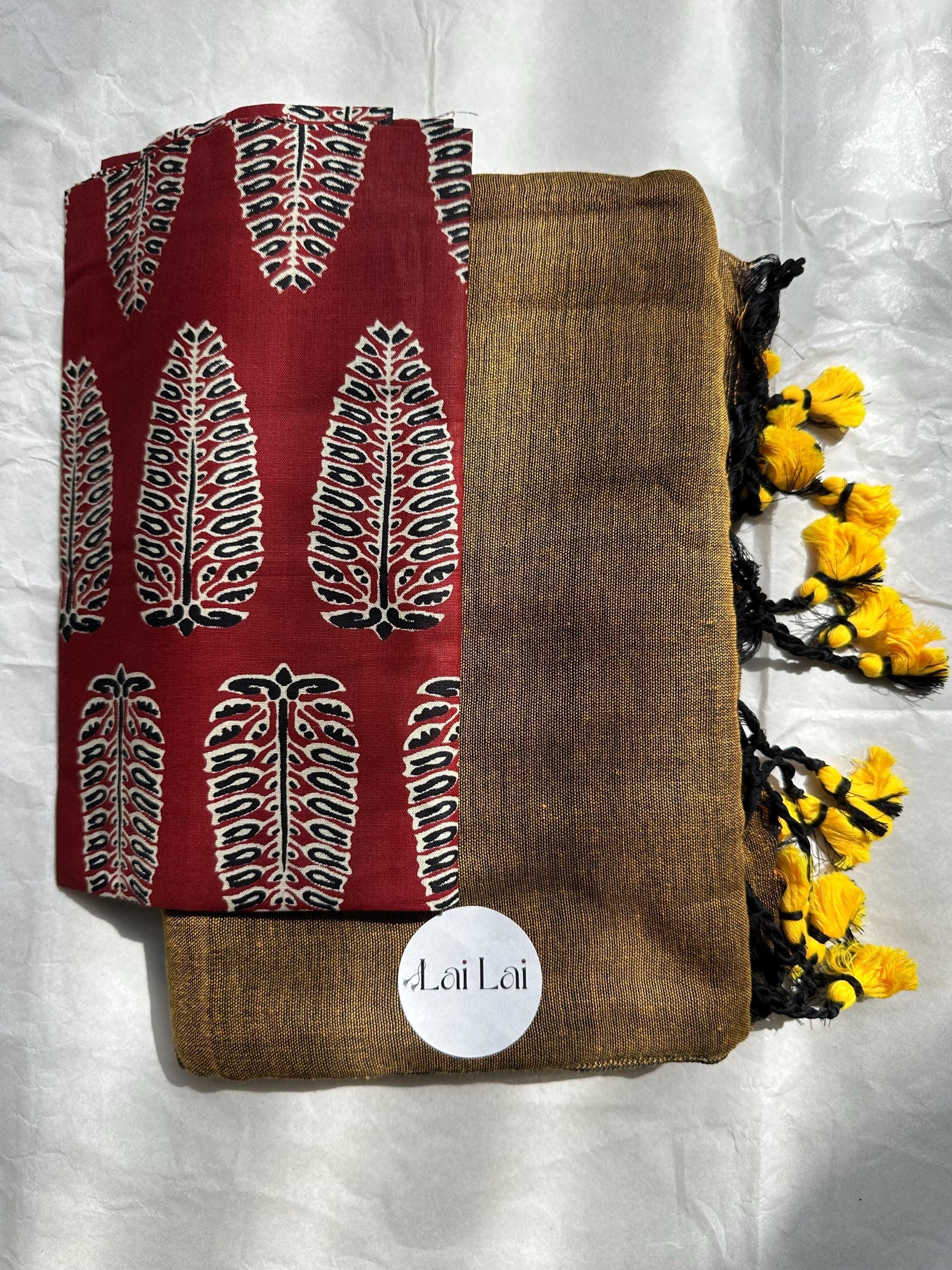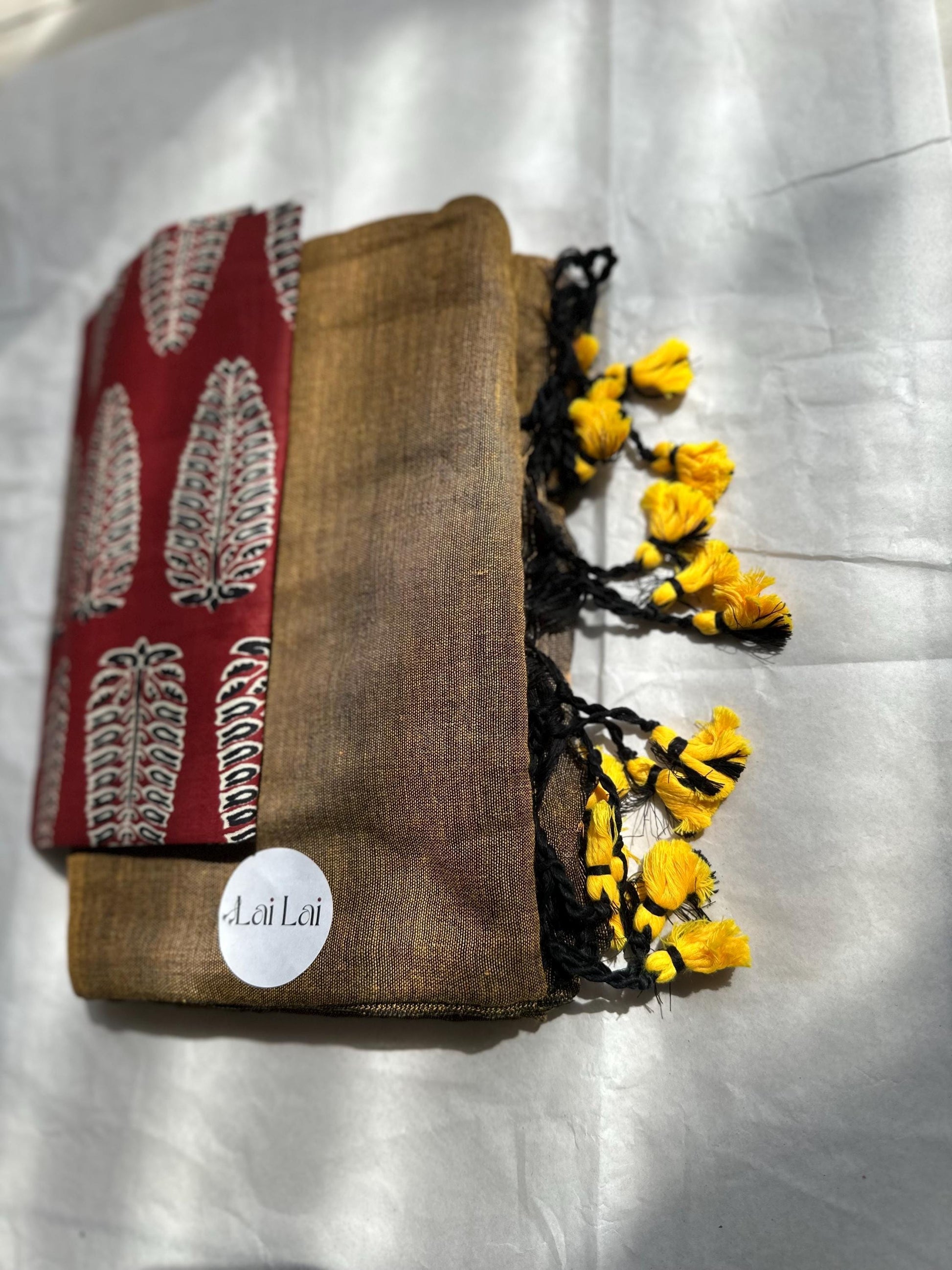 Brown cotton saree with stunning contrast blouse. and red tassels.