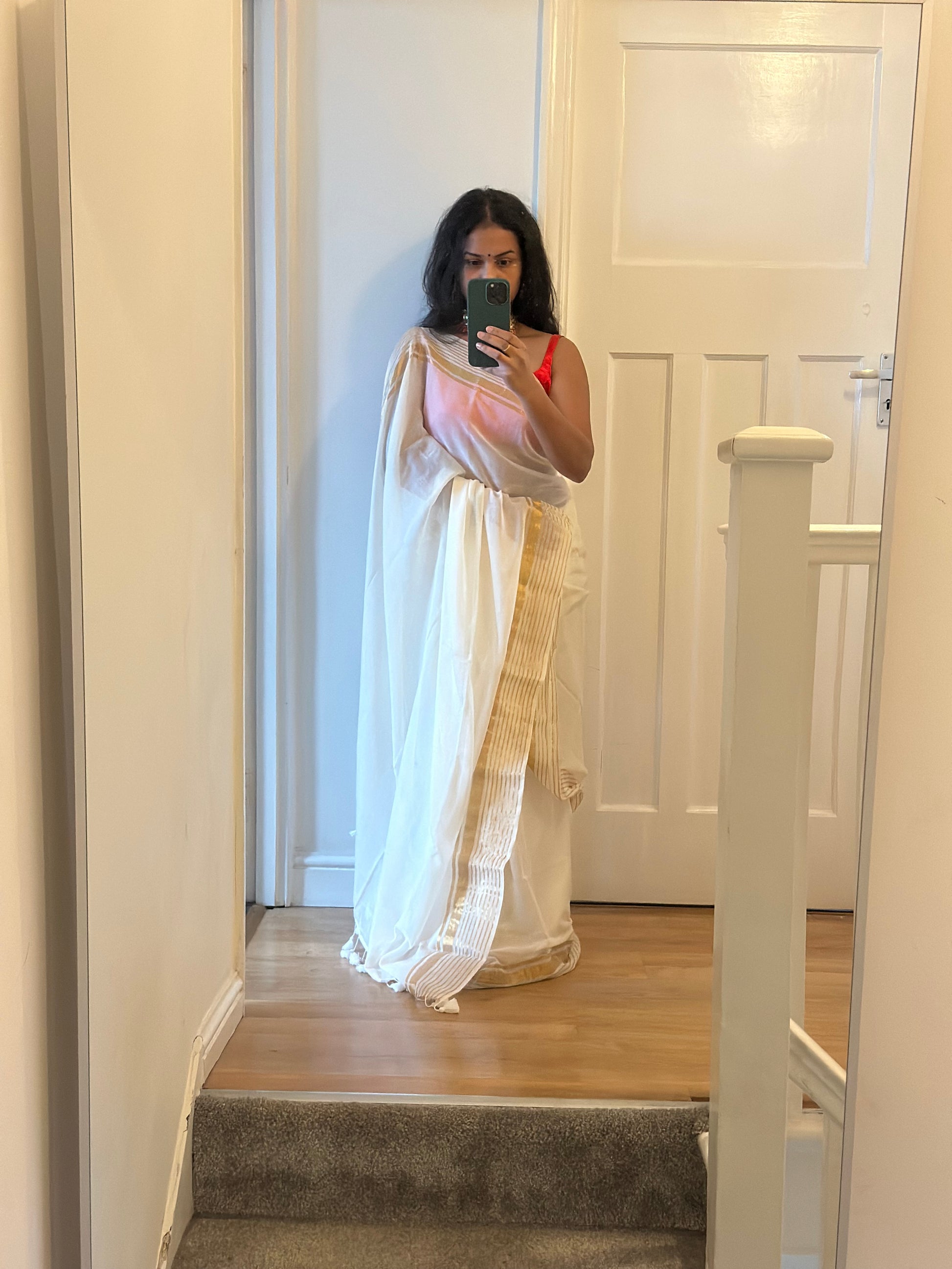 Its lightweight texture makes it ideal for all-day wear, whether for festivals such as onam, casual gatherings, temple visits, or even as an everyday drape. Pair it with statement jewellery for a festive look or keep it minimal for a graceful, understated style.