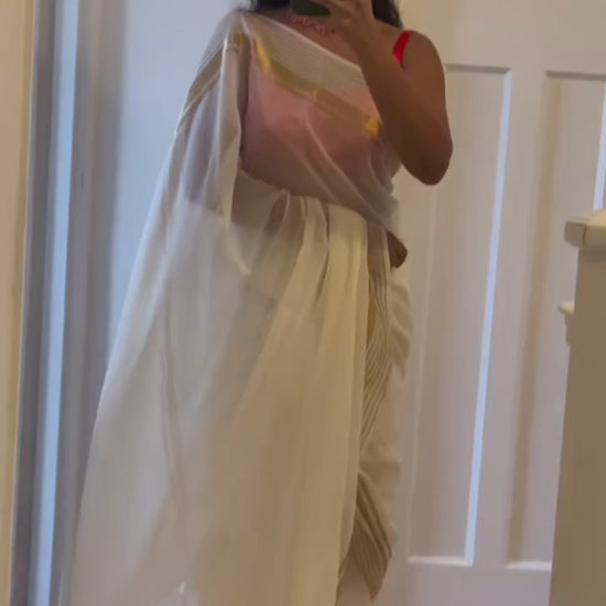 Elegant white pure mul cotton saree with gold zari border and tassels. Lightweight drape for festive and casual wear.