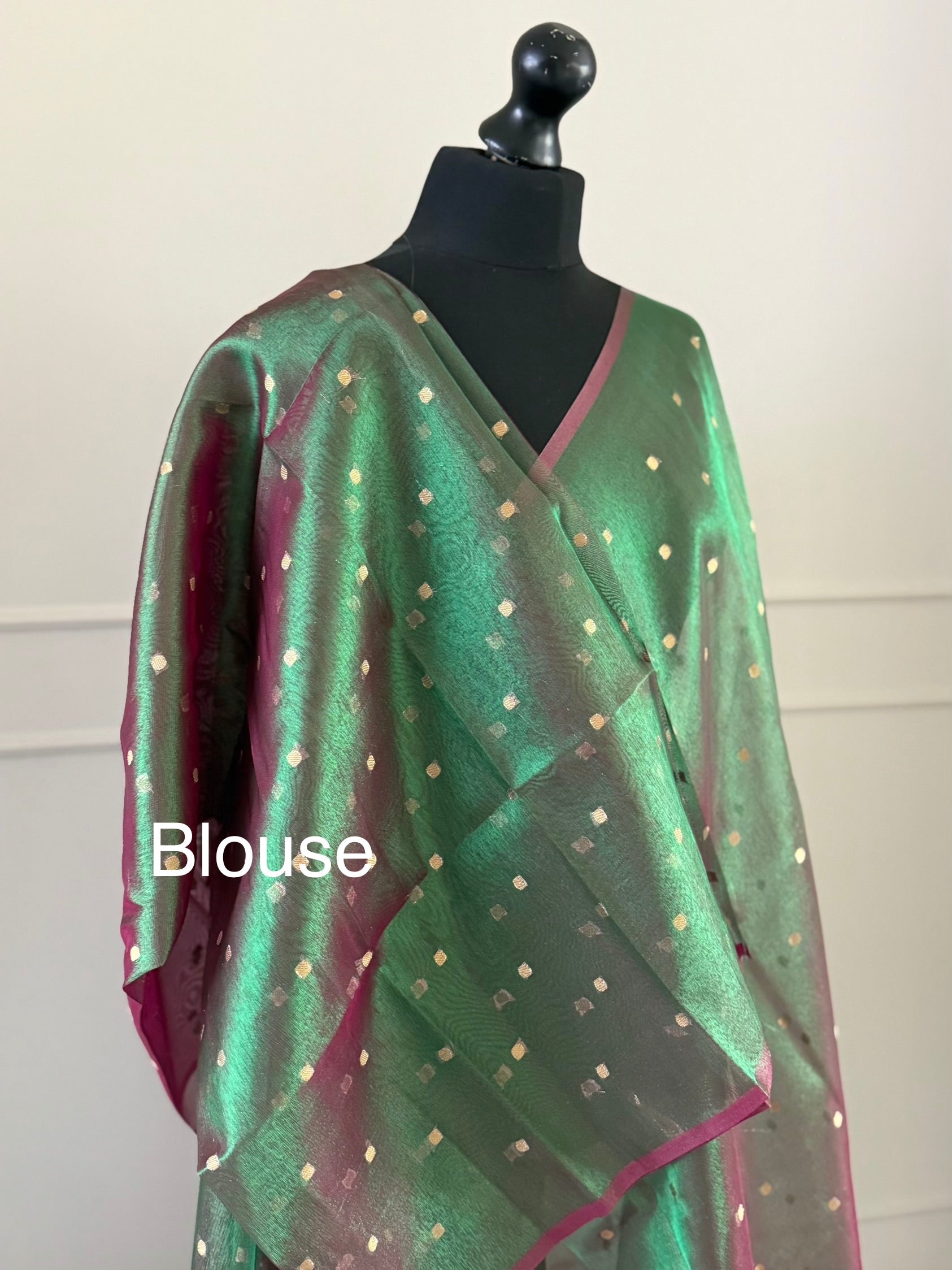 Statement handmade green and magenta dual tone soft tissue saree with unstitched blouse. Gold buti polka dot wedding saree. Unique saree look for events