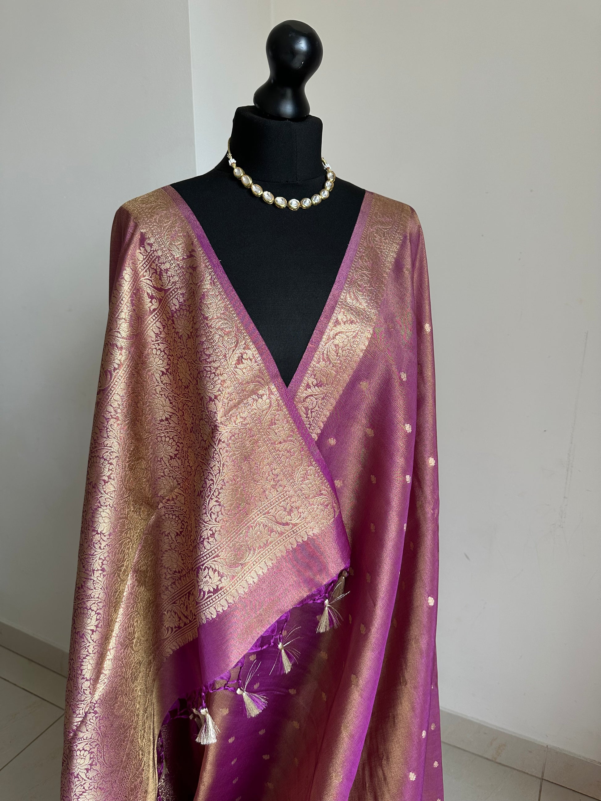 Dual tone magenta and gold semi tissue silk saree. Unstitched brocade blouse.