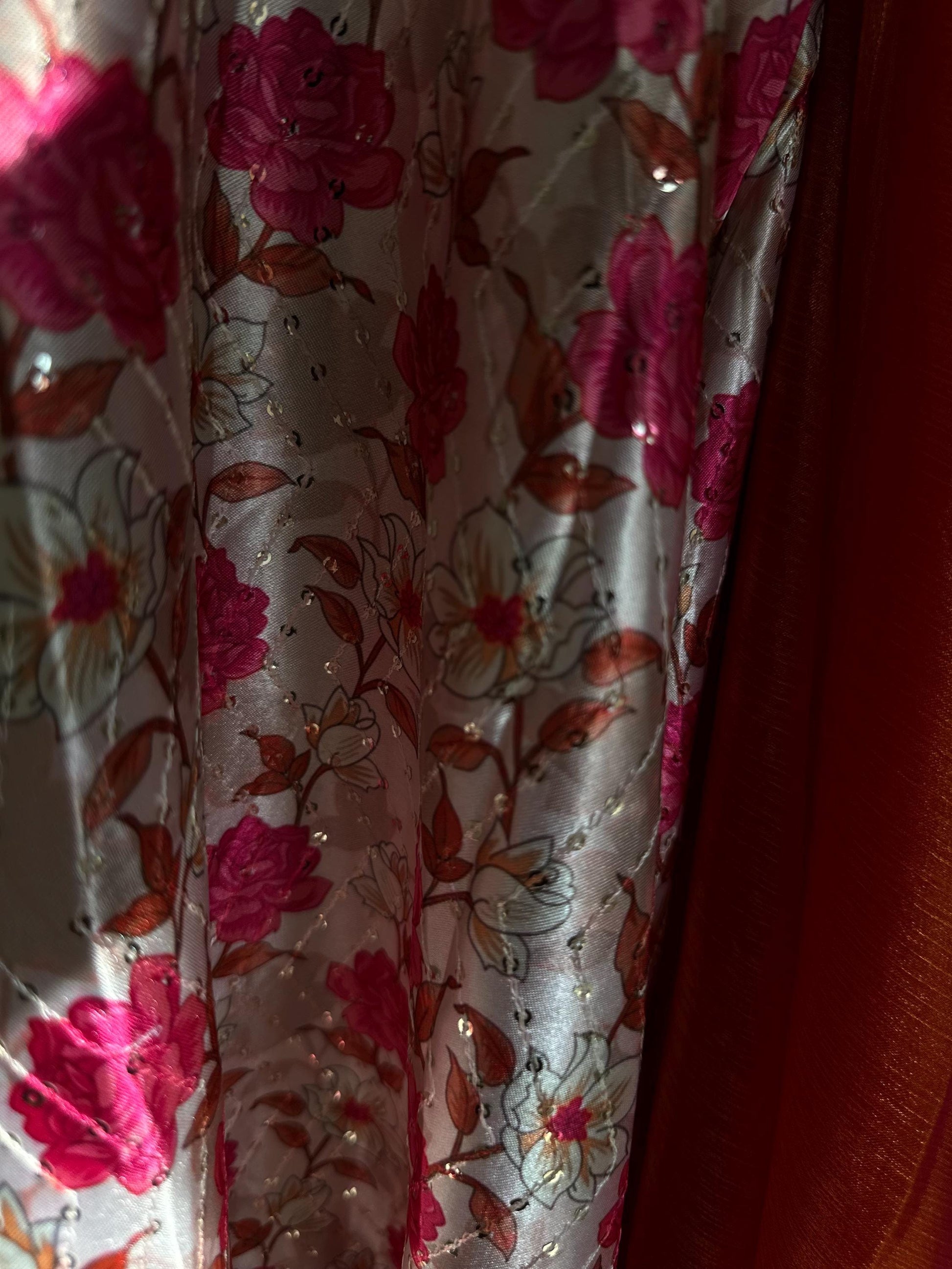 Dual toned coral party designer saree with pink trim border and contrast floral blouse. Unique statement saree can styled with other blouses