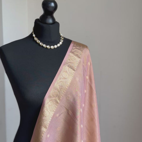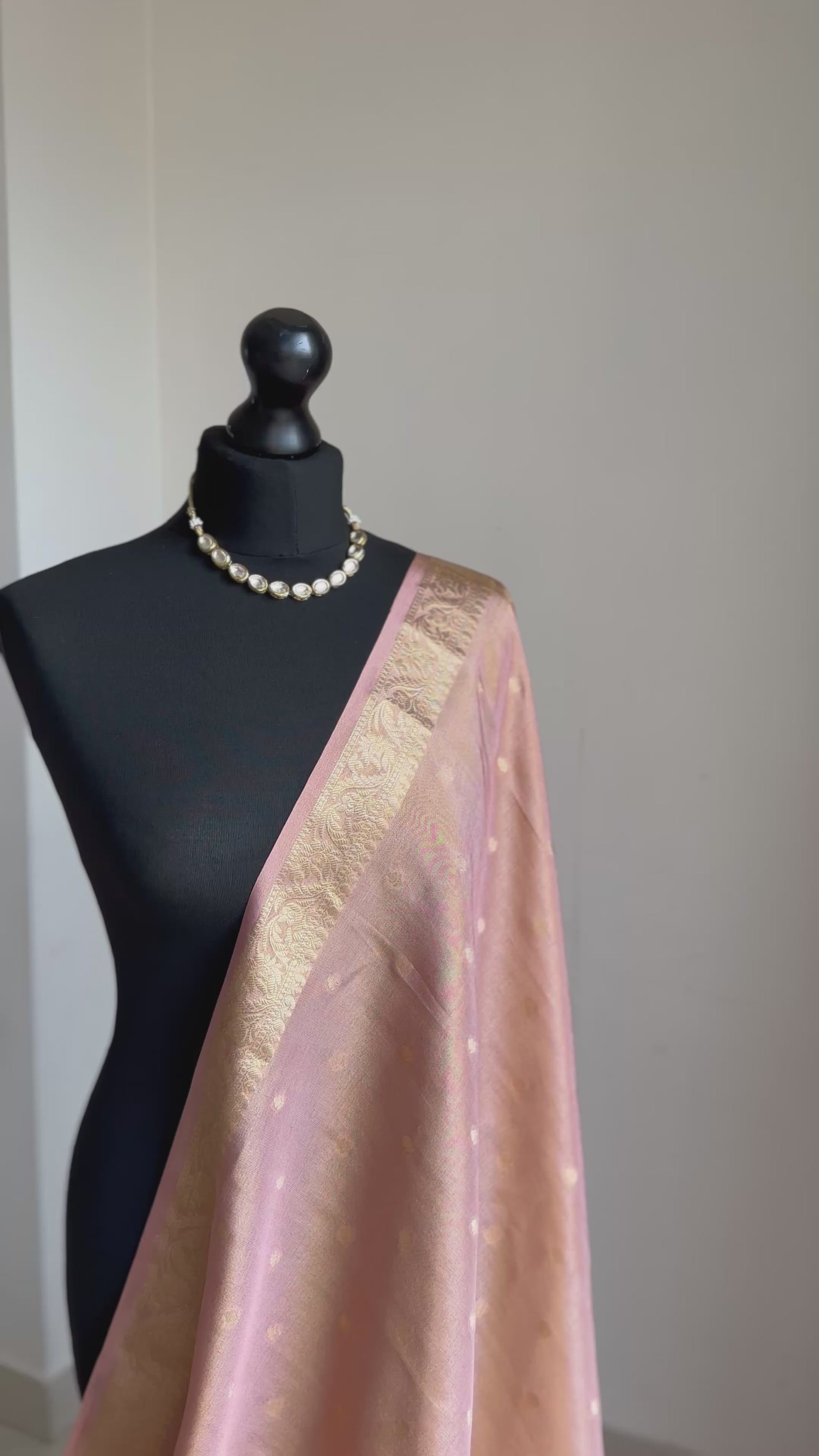 Dual-toned pink and Gold Tissue Saree: Soft to drape with zari border and buta, Unstitched brocade Blouse, Wedding Events