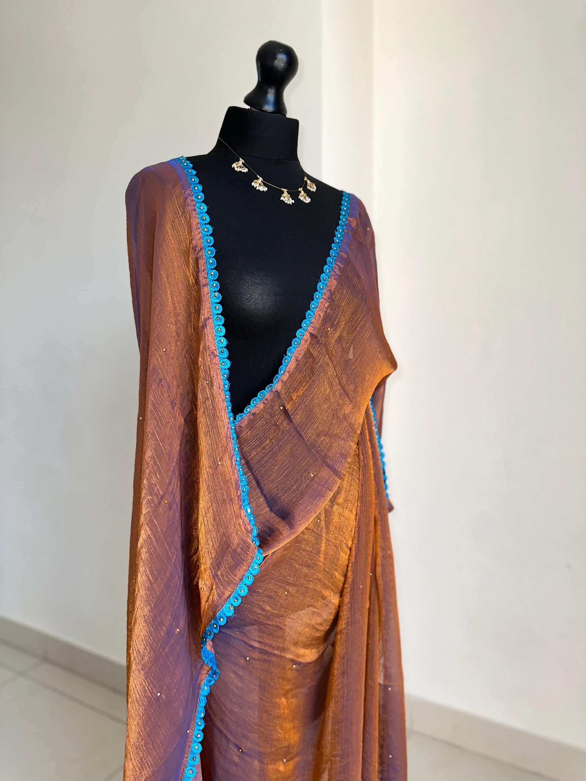 Dual toned rust party designer saree with blue trim border and contrast floral blouse. Unique statement saree can styled with other blouses