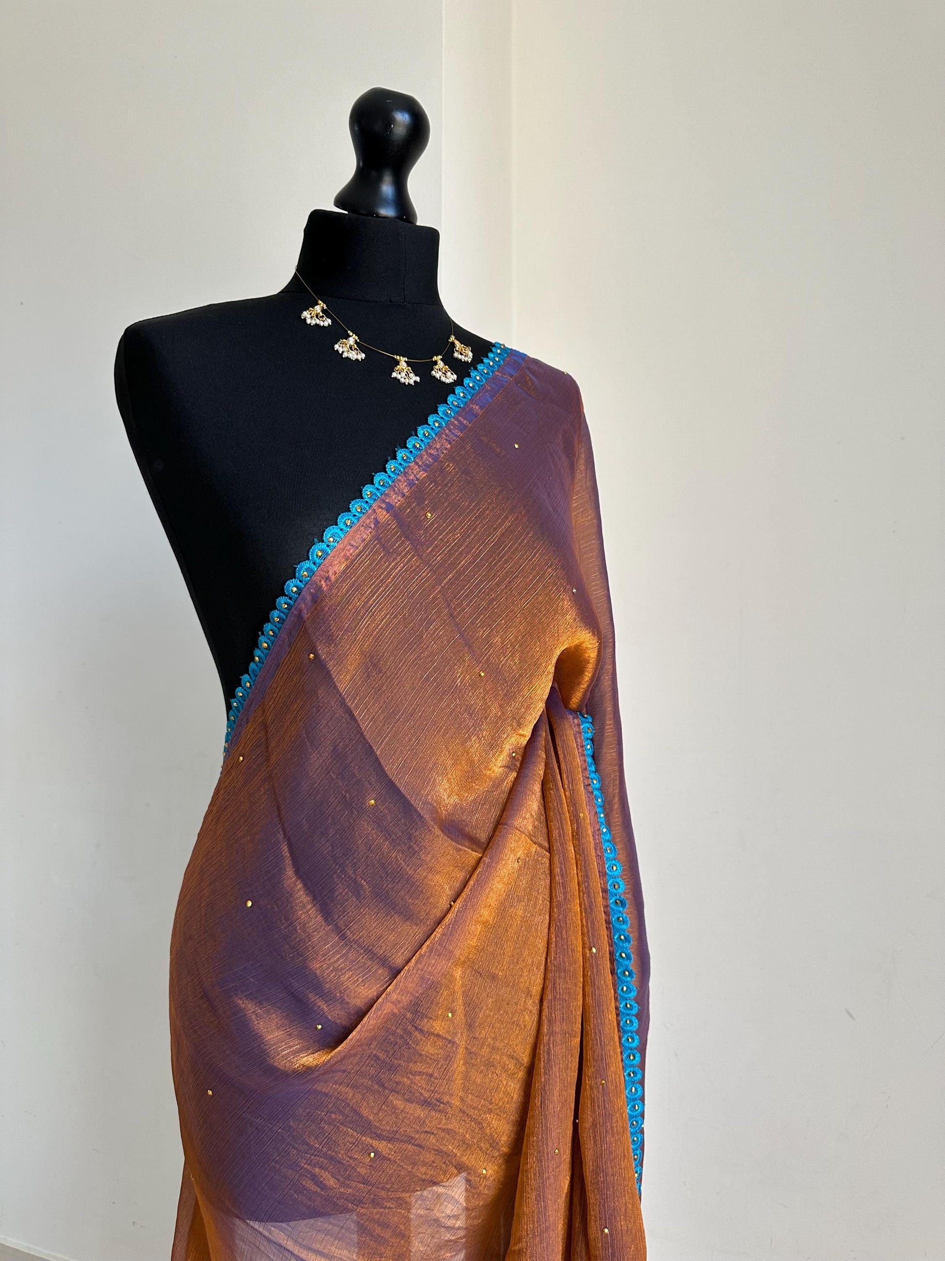 Stunning dual-toned piece crafted in lightweight chiffon fabric, giving it a soft, flowy, and elegant drape. The primary body of the saree features a rich rust shade blended with subtle blue undertones, creating a luminous and iridescent effect as light falls on it.