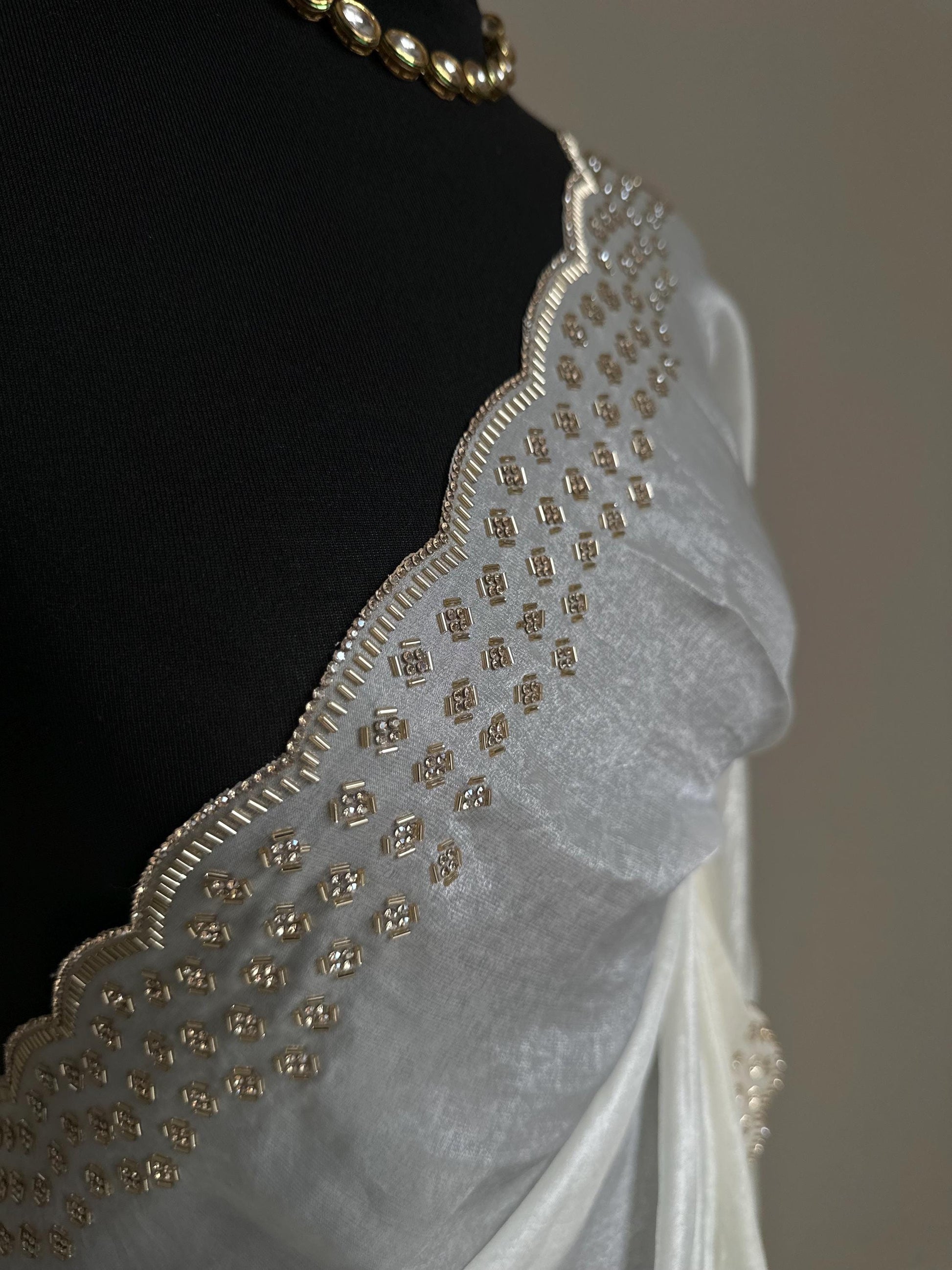 Off white party bridal saree with embellished scalloped border. Soft chiffon versatile saree thats perfect for parties and evening events.