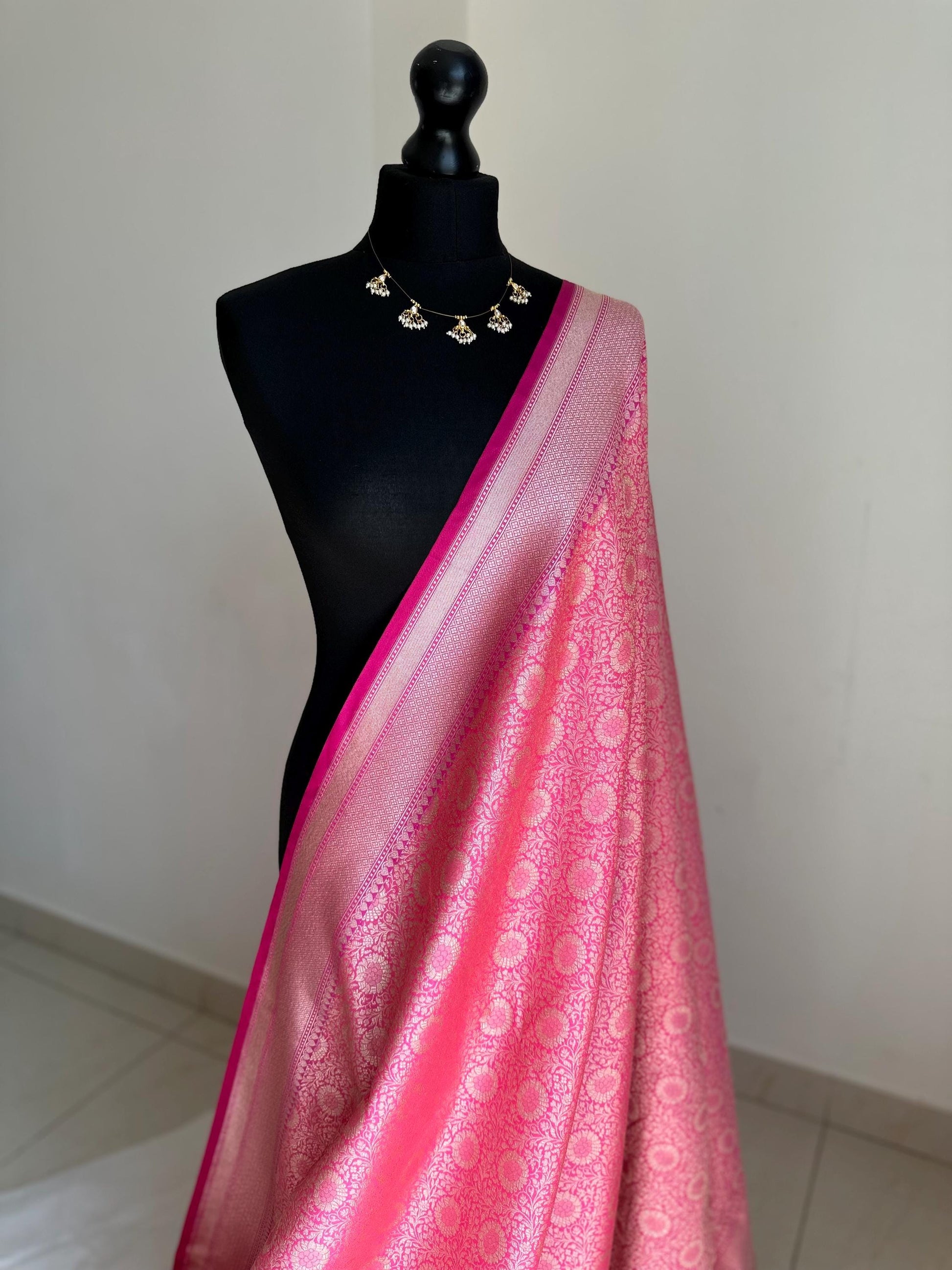 Pink semi silk saree with gold jacquard weave. Indian wedding saree festive banarasi style sari traditional ethnic wear for women