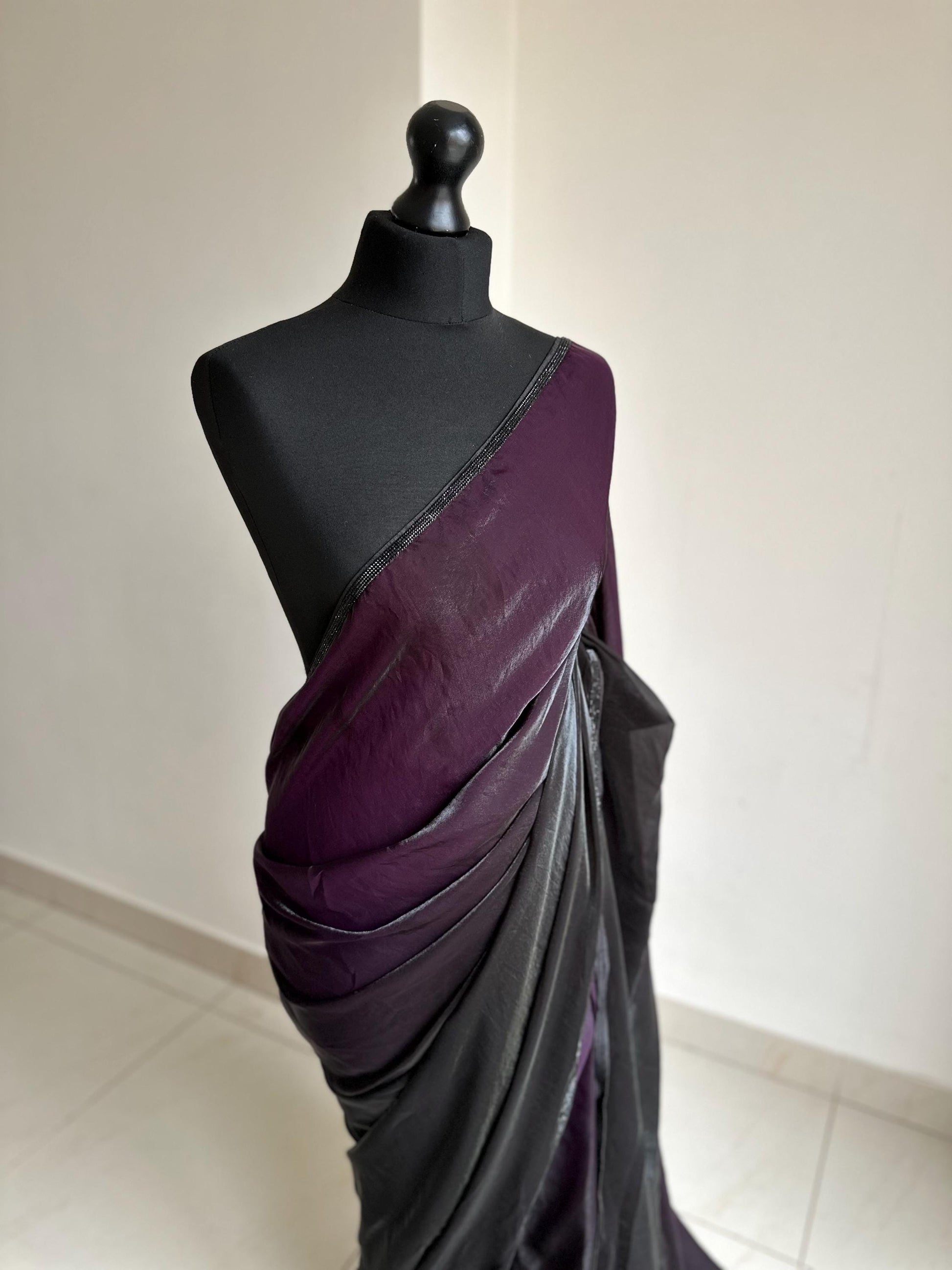 Ready-pleated black and purple shaded saree with cutdana stonework border, comes with belt. Prestitched saree for parties