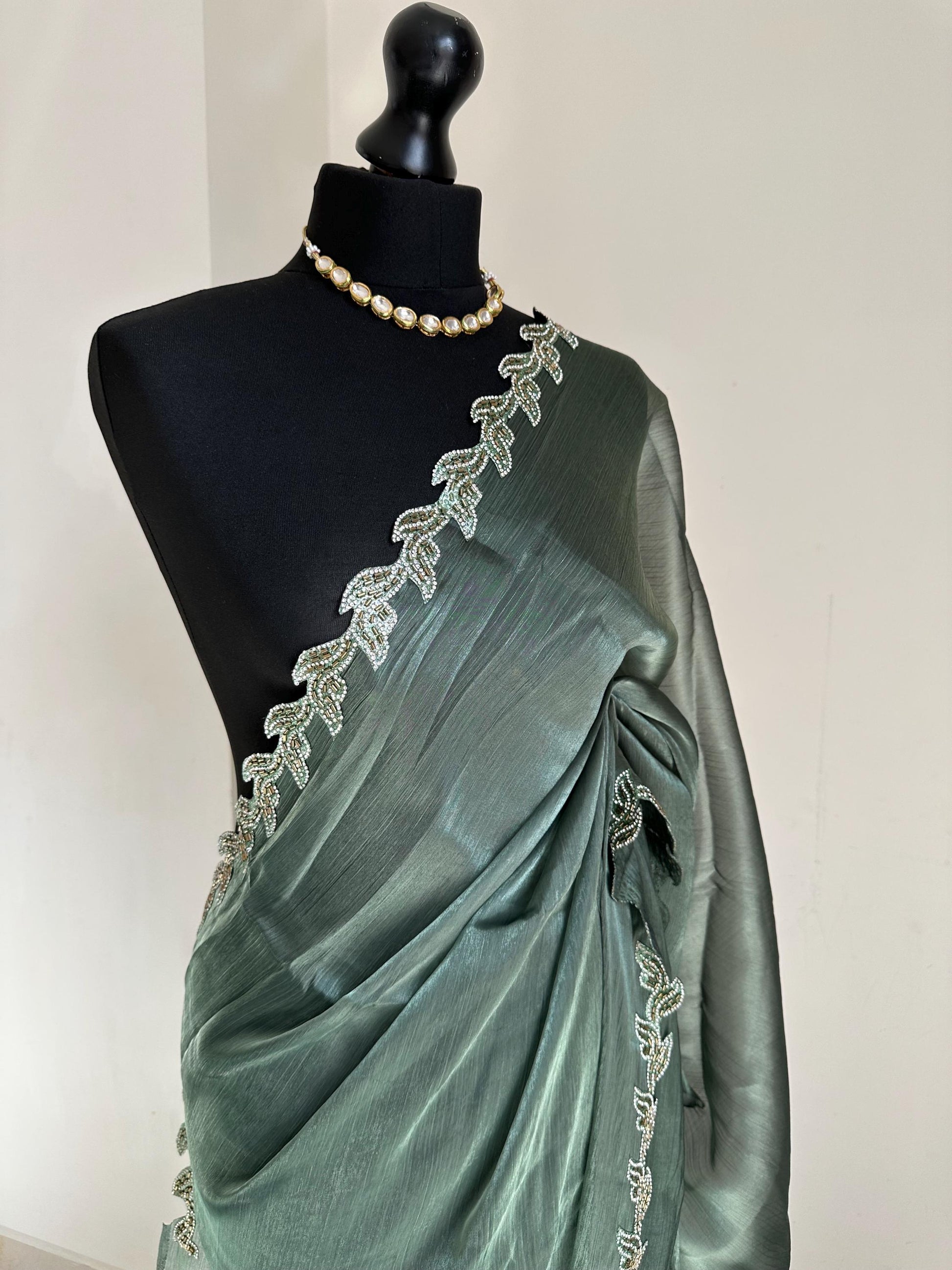 Teal green Saree with embellished Leaf Border | Elegant Party Wear Saree | Minimal Designer Saree | Soft glass chiffon Silk Drape